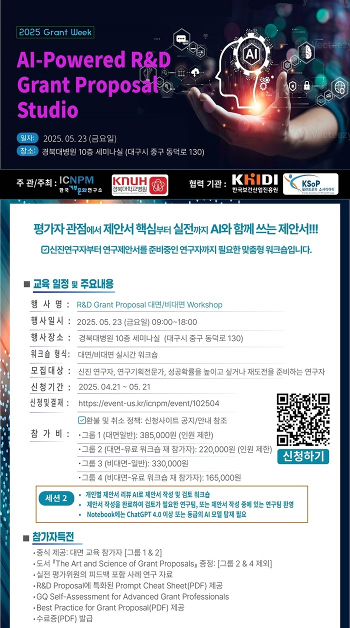 2025년 5월 23일  09:00!8:00, 경북대병원 주최로 "AI-Powered R&D Grant Proposal Studio(부제: 평가자 관점에서 제안서 핵심부터 실전까지 AI와 함께 쓰는 제안서)"라는 주제로 온오프라인 실시간 교육을 진행하였다.